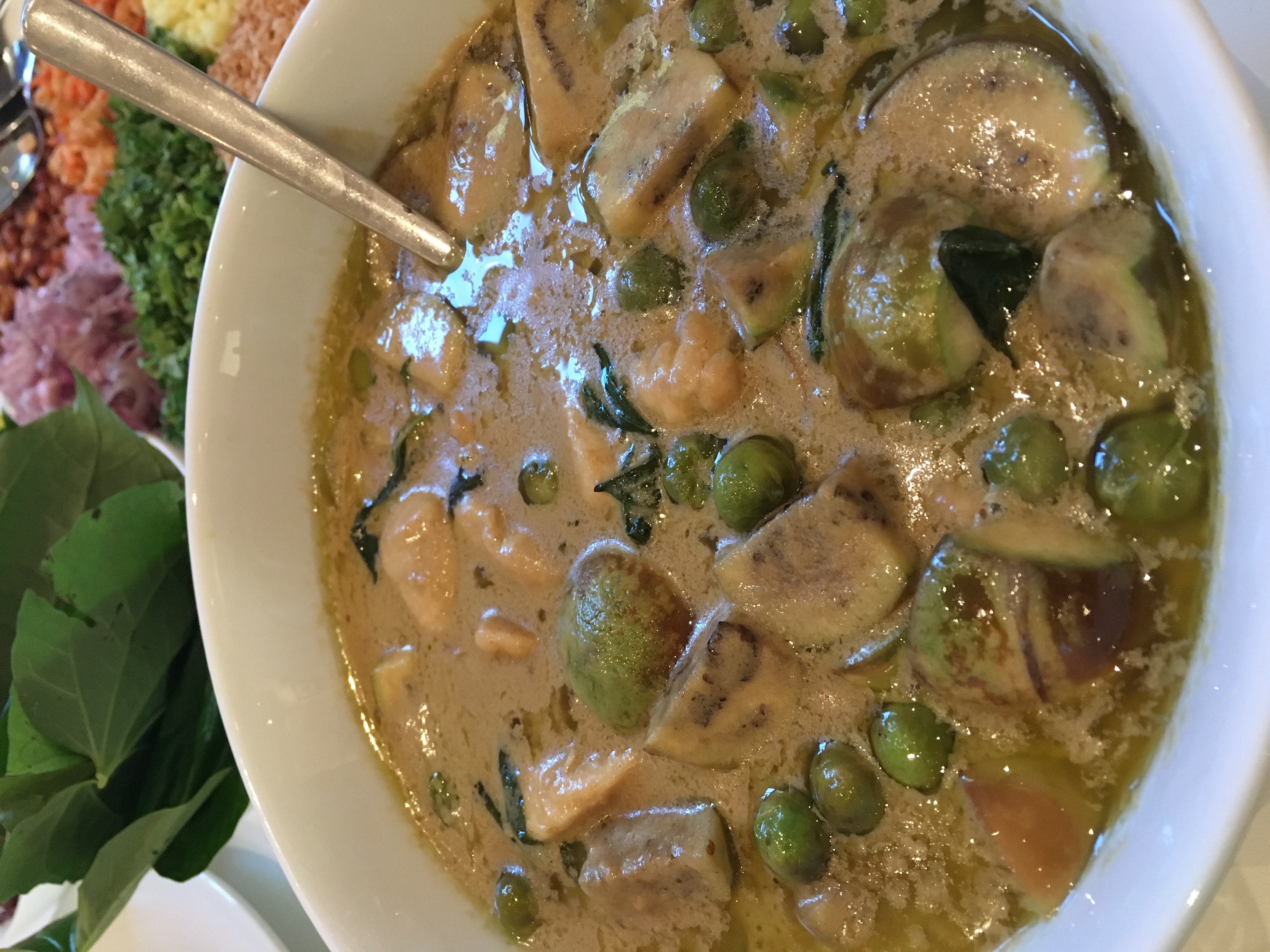 Tilsett curry paste. Rør godt. La den koke inn. Spe sakte med koksmelk. La det koke til den “sprekker” og olje vises på overflaten (NB lav varme). La den småkoke videre til den er redusert til ca ¼ del.