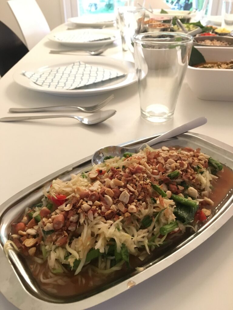 Når papayaen har blitt myk, anrett på et fat, og topp med hakkede peanøtter som er ristet i tørr panne.