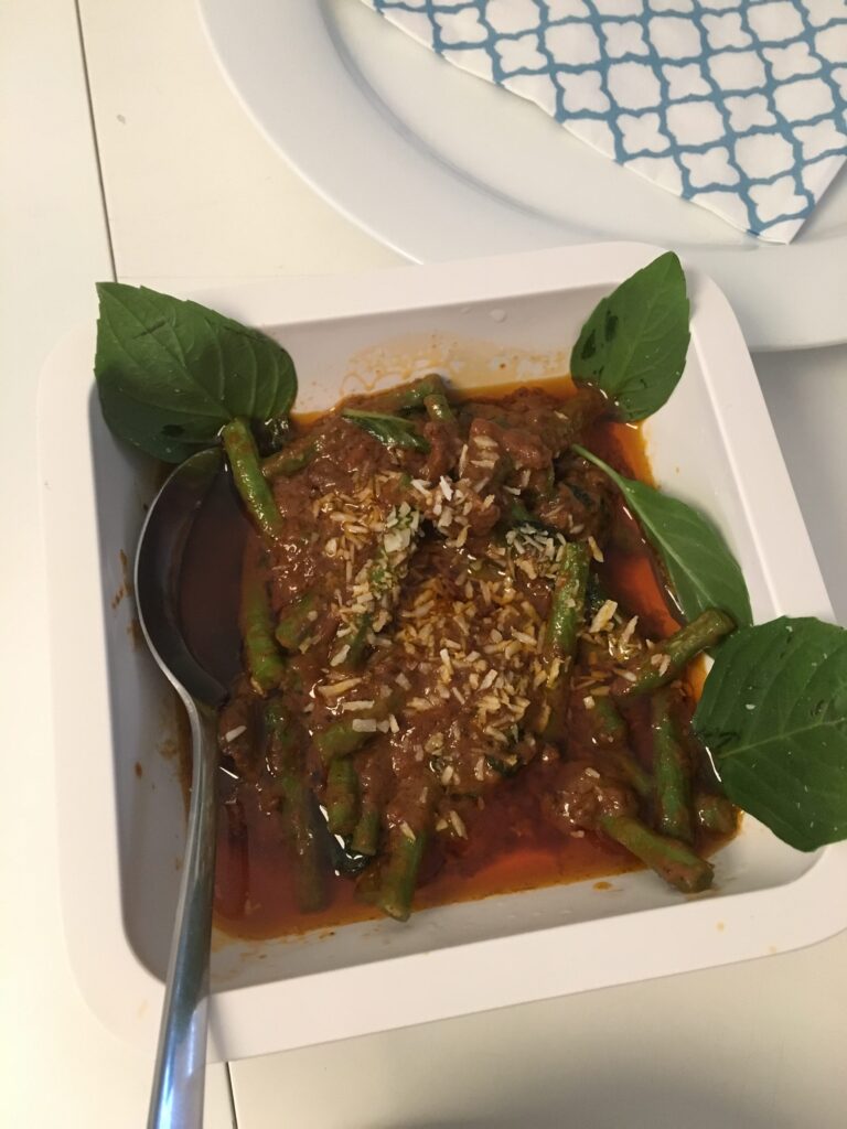 Tilsett curry paste. Rør godt. La den koke inn. Spe sakte med koksmelk. La det koke til den “sprekker” og olje vises på overflaten (NB lav varme). La den småkoke videre i ca 1 time.